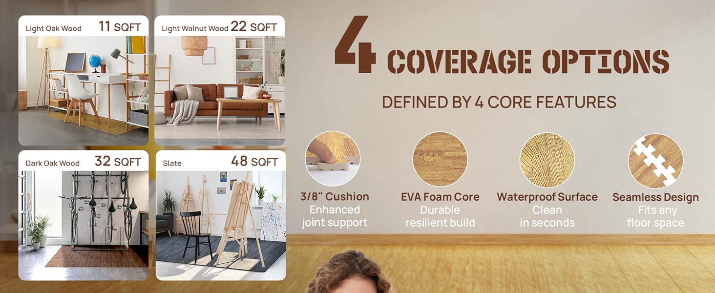 Yes4All EVA Interlocking Mats offer a flexible, durable flooring solution with 12 puzzle-style foam tiles covering 11 sqft. Featuring a double-sided design with wood print and shock-absorbing honeycomb, these 3/8" thick mats provide cushioned comfort, floor protection, and a secure, non-slip fit. Waterproof and easy to clean, they’re perfect for home, office, or garage spaces, with included borders for a polished finish.