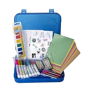 | Included Components | 8 Watercolors, 8 Metallic Crayons, 3 Glitter Glue Tubes, 1 Brush, 8 Stampers, 10 Coloring Pages, 30 Construction Paper Sheets, 1 Colorable Sticker Sheet, 1 Decorative Sticker Sheet, and a Storage Case. |