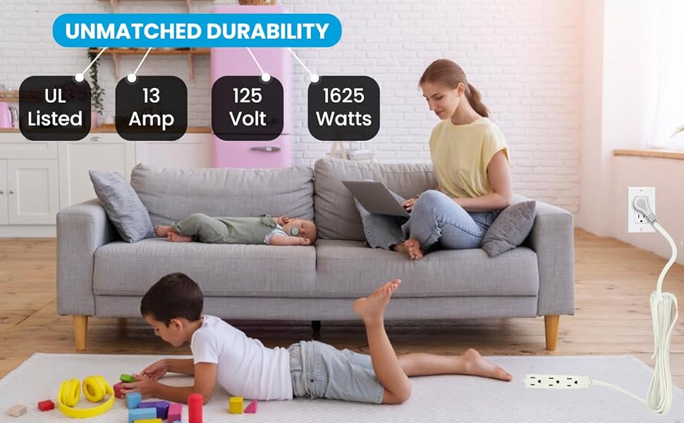This 15-foot extension cord features 3 grounded outlets and a flat plug design, making it perfect for tight spaces. With a durable construction rated for 13 amps and 125 volts, it ensures safety and reliability while providing convenient access to power for multiple devices.