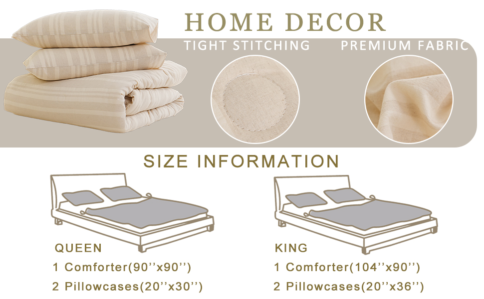 This comforter set includes 1, 90" x 90" comforter and 2, 30" x 20" shams. The linens are made of 75% cotton and 25% linen. We would have preferred it to be softer, but with linen, this is what your get. Linen also has a propensity to wrinkle. The set arrived vacuum sealed. We sliced open the plastic and the comforter expanded. Unfortunately, so did an unpleasant odor emanating from the opened package. We were not especially thrilled about the displeasing smell, but we let it air out a bit and then tossed it in the washing machine. The comforter and both pillowcases washed well using a gentle cycle with cold water. We dried it set on delicate/low heat. Being that linen is used in this comforter, we were expecting it to come out of the dryer especially wrinkled but were surprised the wrinkling was not too severe. We are not interested in ironing the linens, so it will have to be. After laundering, there was no clumping or unevenness with the microfiber filling inside. Thank goodness the distasteful odor disappeared with the washing. Upon close inspection, the seams look well sewn and there are no stray threads or uneven stitching. The shams are what is called envelope pillowcases. This style allows you to place your pillow inside of the case and fold over the inner end flap. This way, you are unable to see any remnant of your pillow. It gives a cleaner look to your overall bed. We are going to use the shams as decorative pieces on the bed rather than pillowcases, as the material is a bit too coarse to lay your head on comfortably.The linen set is basic, simple and looks fine. There is nothing special about it, but it presents well. This is a lightweight comforter, great for those hot summer months. It's a nice set for a college student.