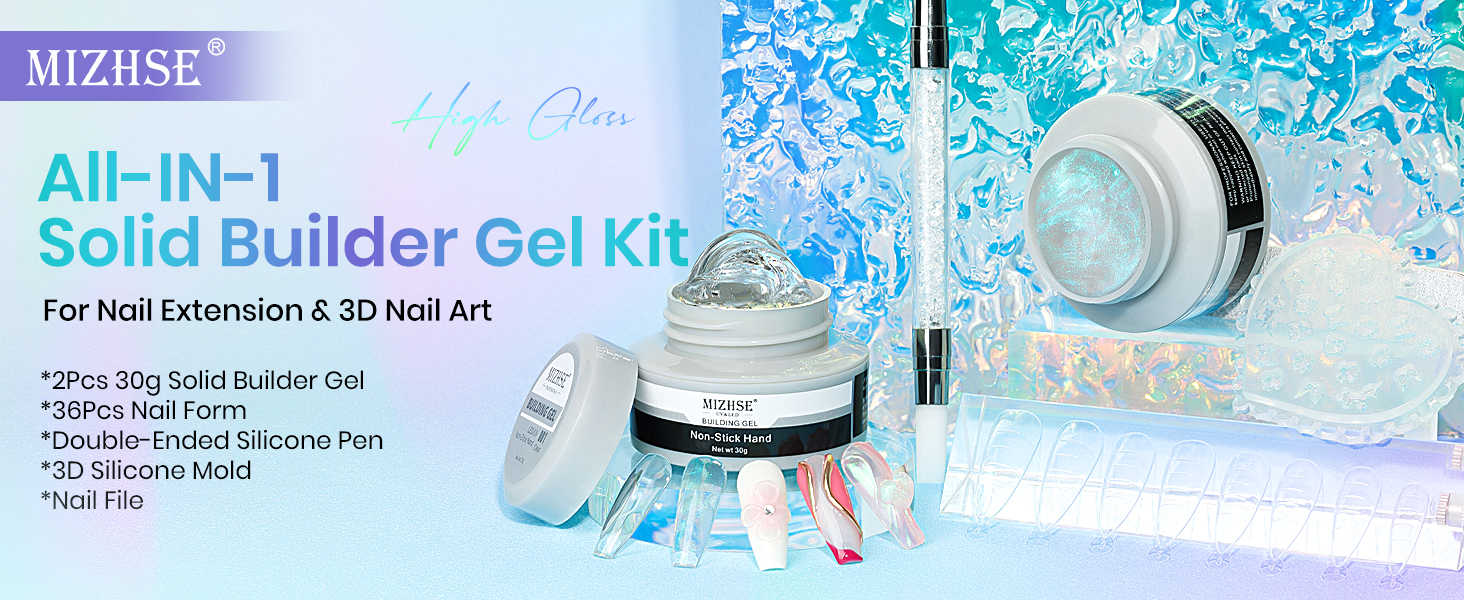 MIZHSE Solid Builder Gel Kit features two 30g hard gels in Mermaid Pearl and Clear shades, combined with 36 nail forms, a 3D mold, and a dual-ended sculpture pen. This solid, non-sticky gel enables easy, mess-free nail extensions and 3D designs without clips or extra tools. Made from natural resin, it offers up to 28 days of durable, healthy wear—ideal for both beginners and nail art enthusiasts seeking salon-quality results at home.