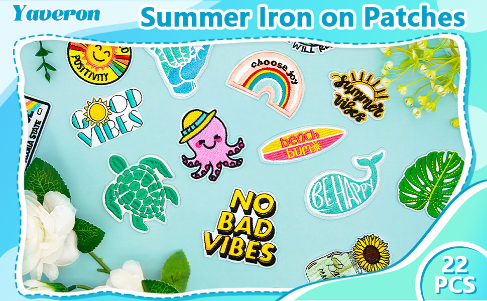 This 22-piece set of vibrant, embroidered summer-themed iron-on patches features durable materials and hot melt glue backing for easy, long-lasting application on clothing, backpacks, hats, and more—perfect for DIY customization and stylish repairs.