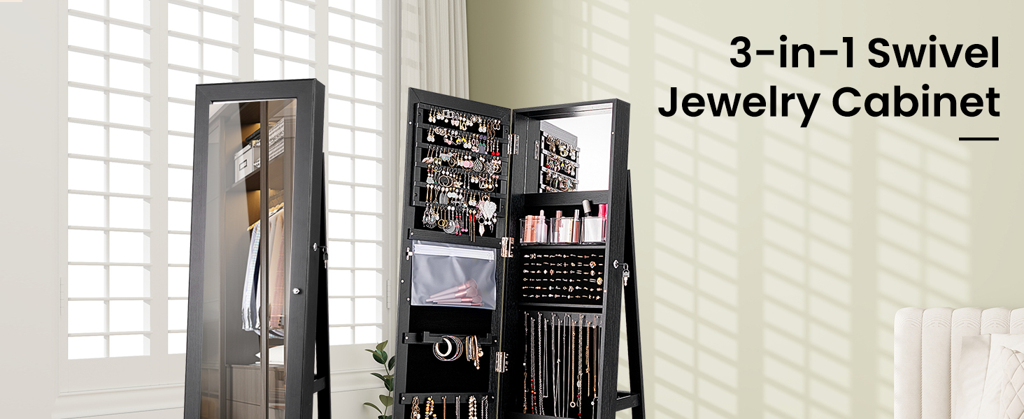 The CHARMAID 360° Swivel Jewelry Armoire is a modern, lockable organizer featuring 120 earring slots, a full-length mirror, and a 360-degree swivel base. Crafted from polished black P2 MDF with velvet lining, it offers extensive storage including rear shelves and multiple compartments, combining style, security, and convenience for the discerning jewelry lover.