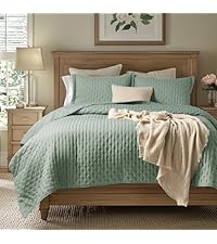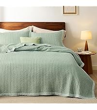 The Bedsure 100% Cotton Quilt Set features a queen-sized (90x96 inches) lightweight coverlet made from breathable cotton voile, paired with two matching pillow shams. Designed for all-season use, its durable dense stitching and modern sage green geometric pattern combine practicality with elegant style. Easy to care for and versatile, this 3-piece set offers lasting comfort and sophistication for any bedroom.